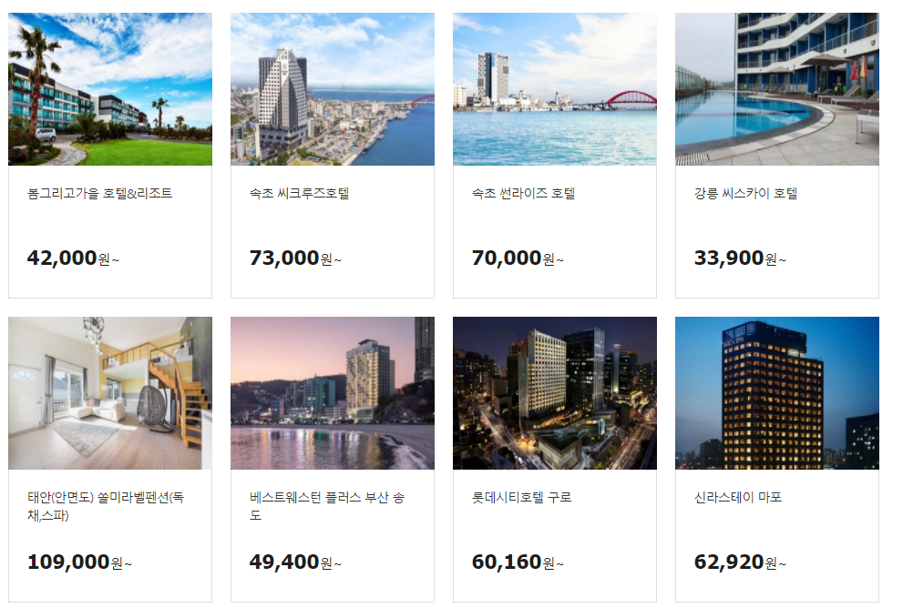 근데 보통 근로자들은 오션뷰나 인기가 많은 호텔에 숙박하고 싶은 욕구가 있는데, 그렇게 메이져급 호텔은 나와 있지 않은듯 보입니다.. 좋은 호텔들은 복지몰에 놓지 않아도 예약이 항상 풀로 차니 굳이 신청하지 않은것같습니다.. (좋은 호텔을 좋은 가격에 가고싶은데..)
