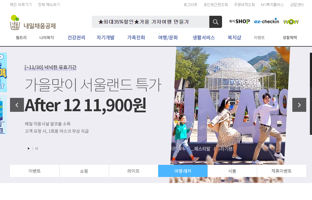 건강관리, 자기계발, 가족친화, 여행/문화, 생활서비스, 복지샵 등 많은 카테고리가 여러분을 기다리고 있는 것을 볼 수 있습니다.