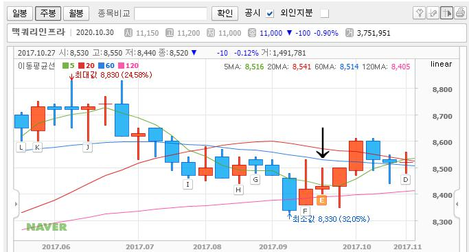 2017년 6월부터 2017년 11월까지의 맥쿼리인프라 주봉 주식 차트 흐름입니다.