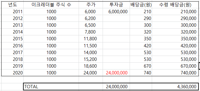 2010년부터 2019년까지 이크레더블 배당을 살펴보면 210원부터 꾸준히 성장하여 2019년에는 740원까지 올라와 있는 상태로, 1주당 이크레더블 배당금 740원이다. (24,000원 1주당 740원이니 약 3.08%의 배당률로 계산할 수 있다. 만약 2011년 주가인 5700원에 1000주를 매집하여 지금까지 가지고 있었을 경우 시세차익+배당금은 아래 표와 같다.