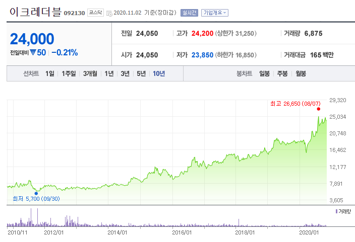 이크레더블 주가변동은 2010년 최저점 5,700원을 찍고 이후로 계속적으로 우상향하는 모습을 보여줘, 현재 2020년 11월 2일 현재가는 24,000원이다. 10년만에 5배가 상승한 이크레더블 주가, 어떻게 이런 가격 상승을 가져올 수 있었을까?