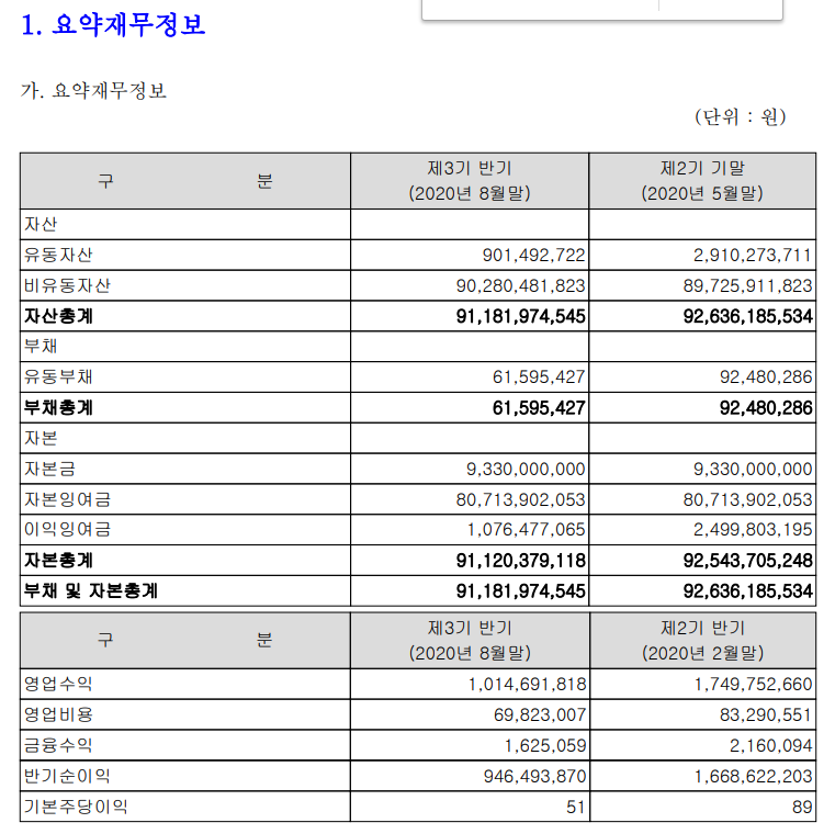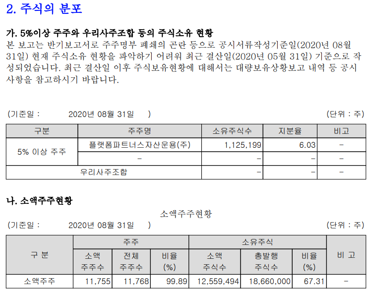 5% 이상 주주는 플랫폼파트너스 자산운용(주) 에서 6.03%인 1,125,199주 점유하고 있다. 본인이 투자한 기업이 보고서를 작성했을 때는 반드시 챙겨서 저번 보고서와 어떤 차이점이 있고, 주당순이익 변화가 있는지 어떤 호재가 발생했는지에 대해 꼼꼼하게 읽고 내 포지션을 정하도록 하자.