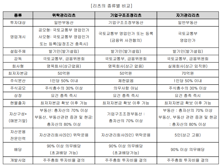 -> 투자자들로부터 자금을 모아 부동산이나 부동산 관련 자본 및 지분(Equity)에 투자하여 발생한 수익을 투자자에게 배당하는 회사나 투자신탁. 'Real Estate Investment Trust' 의 약자이며 부동산투자신탁 이라는 뜻이다. 보통 소액 투자자들로 대부분의 지분을 이룬다.