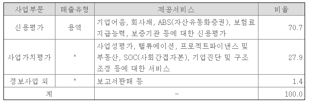 위에서 보는 자료 그대로 한국기업평가는 신용평가, 사업가치평가, 정보사업 등을 주 무대로 움직이고 있다.
