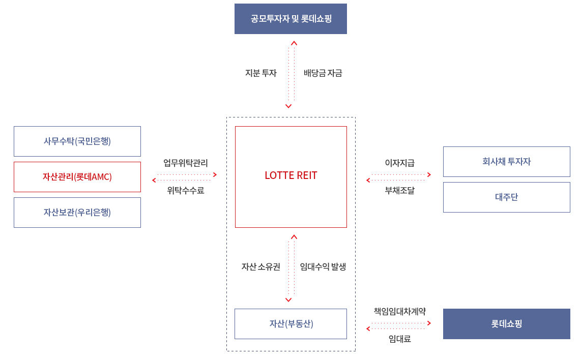 다른 재간접리츠의경우 위와 같이 자산보관, 사무수탁 및 롯데AMC에 투자금을 맡겨 따로 수수료가 발생하는 구조이다. (자산관리에 대한 수수료를 우리 투자자가 부담하는 구조이며 재간접 리츠의 공통적인 특징이다.)