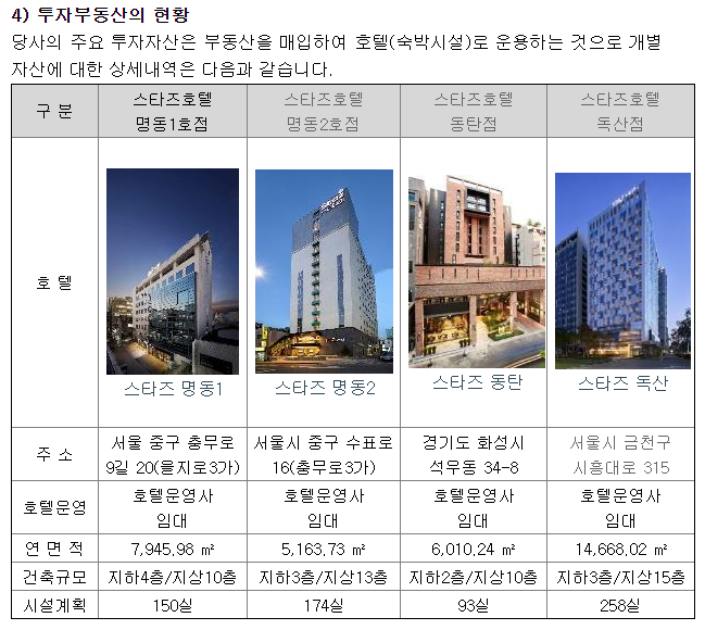 투자자들에게 자금을 확보하여 대상 부동산을 취득하고, 자산관리시스템을 도입하여 시장요구수익률 수준의 배당을 실시하는 회사이다. 건축 리모델링 및 신축 후 관광호텔을 운영한다. 이렇게 임대받은 호텔 운영화사가 관광호텔을 운영하면서 리츠 투자자에게 운용에 따른 안정적인 수익(임대료)를 배당하고, 일정기간 운용 후 처분함으로써 자본이득도 추구한다. NPL부동산 및 호텔 취득, 신규개발사업에 대한 투자를 병행해나갈 예정이라고 함.