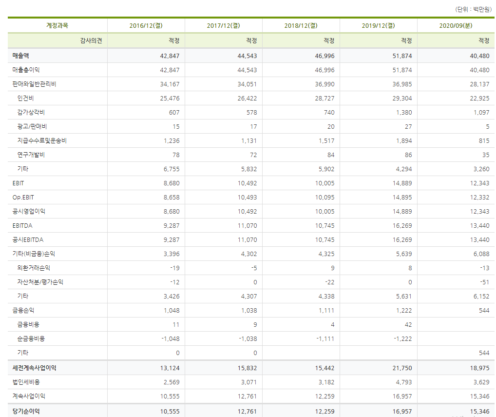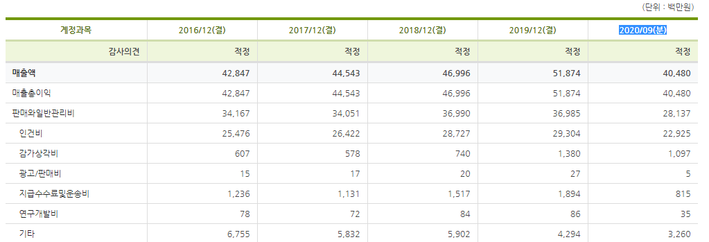 16년도부터 오른쪽으로 17, 18, 19년도 그리고 최근인 20년 9월까지의 재무제표를 한눈에 볼 수 있다.