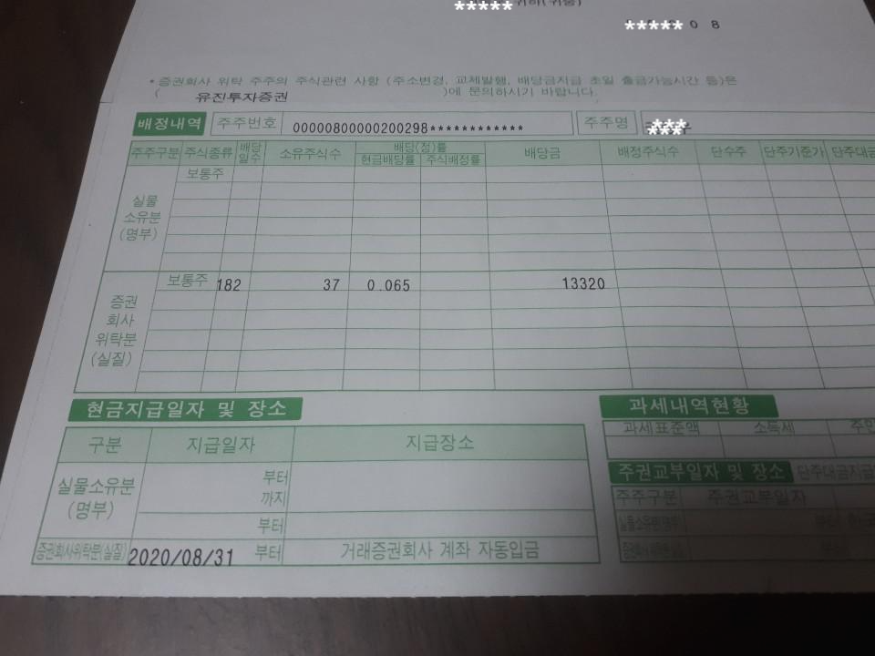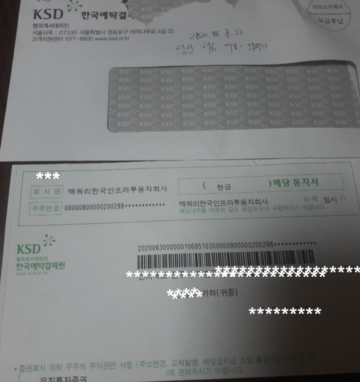 1년에 2회 맥쿼리인프라 배당을 실시하는 기업입니다. 6월 27일에 제 이름으로 37주가 주주명부에 들어간 것이고, 투자금에 대한 배당금을 8월 31일에 실제 주식 계좌로 배당받은 것이지요. (배당락일-12월27~29일은 2월 28일정도에 실제 배당금이 입금됩니다)