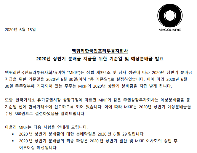 맥쿼리인프라 배당, 배당금, 배당일 1부 끝으로,,